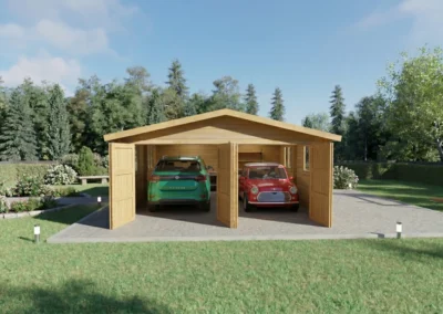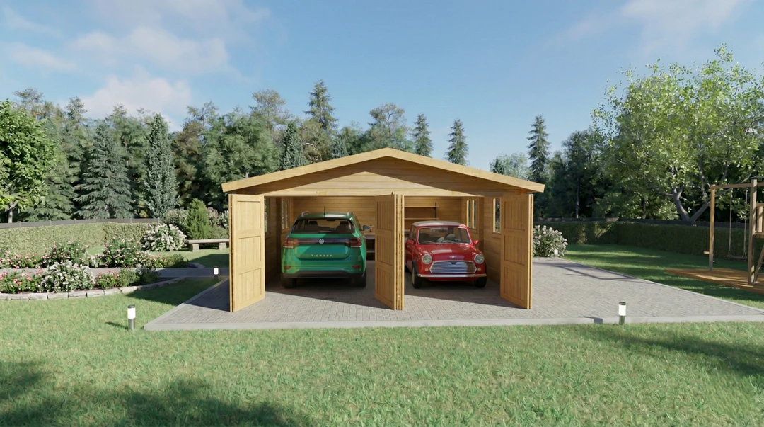 El garaje de madera para dos coches Garage Double de DSAVIA ofrece 35,4 m² de espacio protegido con estructura prefabricada, puertas dobles, puerta lateral, ventana con doble acristalamiento y múltiples opciones de personalización. Disponible desde 6.040 € (IVA incluido), es una solución práctica, estética y competitiva para proteger tus vehículos.