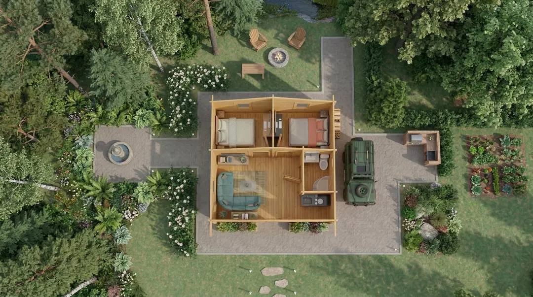 Si buscas una mini casa de madera con distribución completa para toda la familia, el modelo Vasto de DSAVIA reúne todo lo que necesitas en apenas 35,4 m². Con cuatro estancias diferenciadas —salón con cocina, dormitorio principal, habitación infantil y baño—, esta cabaña prefabricada de una planta ofrece confort real sin renunciar a la calidez de la madera.